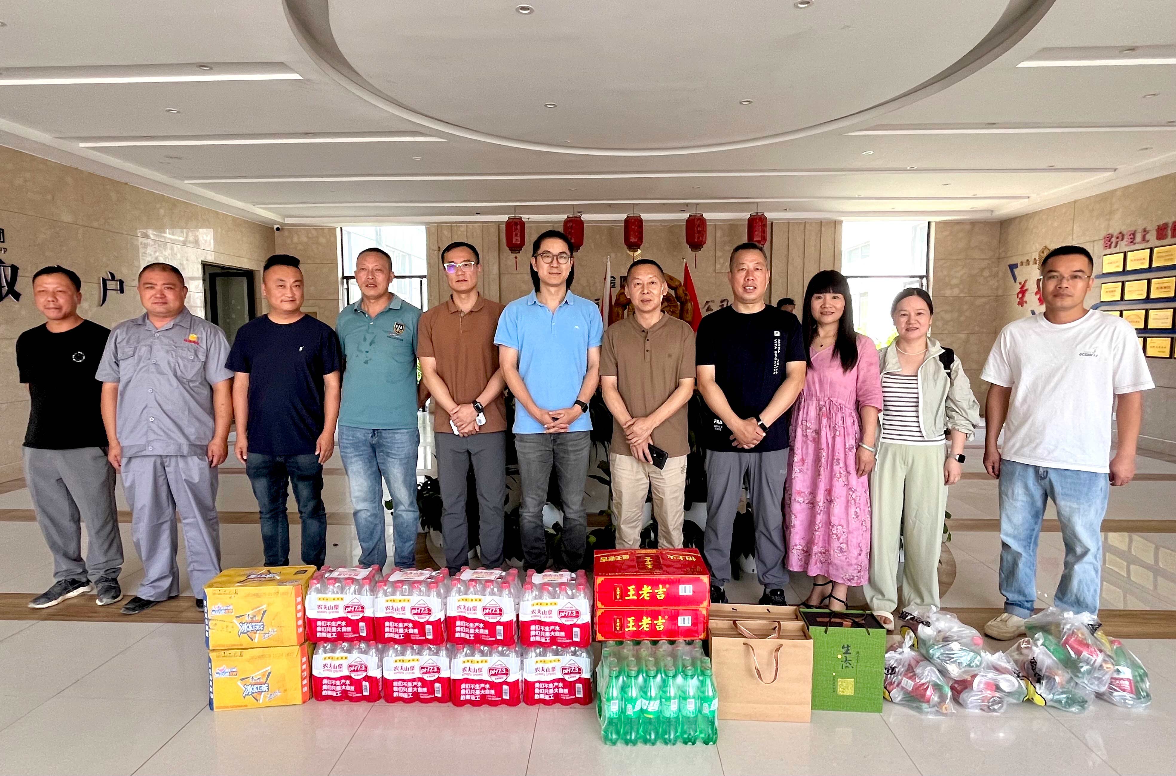 集團(tuán)高管層分三路慰問(wèn)近20家子公司。走訪中,集團(tuán)領(lǐng)導(dǎo)深入子公司生產(chǎn)場(chǎng)地,了解各家公司的生產(chǎn)任務(wù)安排和員工的作息排班情況?!按蠹倚量嗔?,高溫天氣一定要做好防暑降溫工作!”在高溫工作現(xiàn)場(chǎng),傅融總裁代表集團(tuán)向奮戰(zhàn)在一線的員工致以親切的問(wèn)候,并為他們送上冰紅茶、王老吉、礦泉水等清涼物資,對(duì)他們?cè)诟邷叵聢?jiān)守崗位表示感謝。傅總叮囑大家工作中要增強(qiáng)安全防護(hù)意識(shí),落實(shí)好防暑降溫措施,確保安全生產(chǎn),平安度夏。